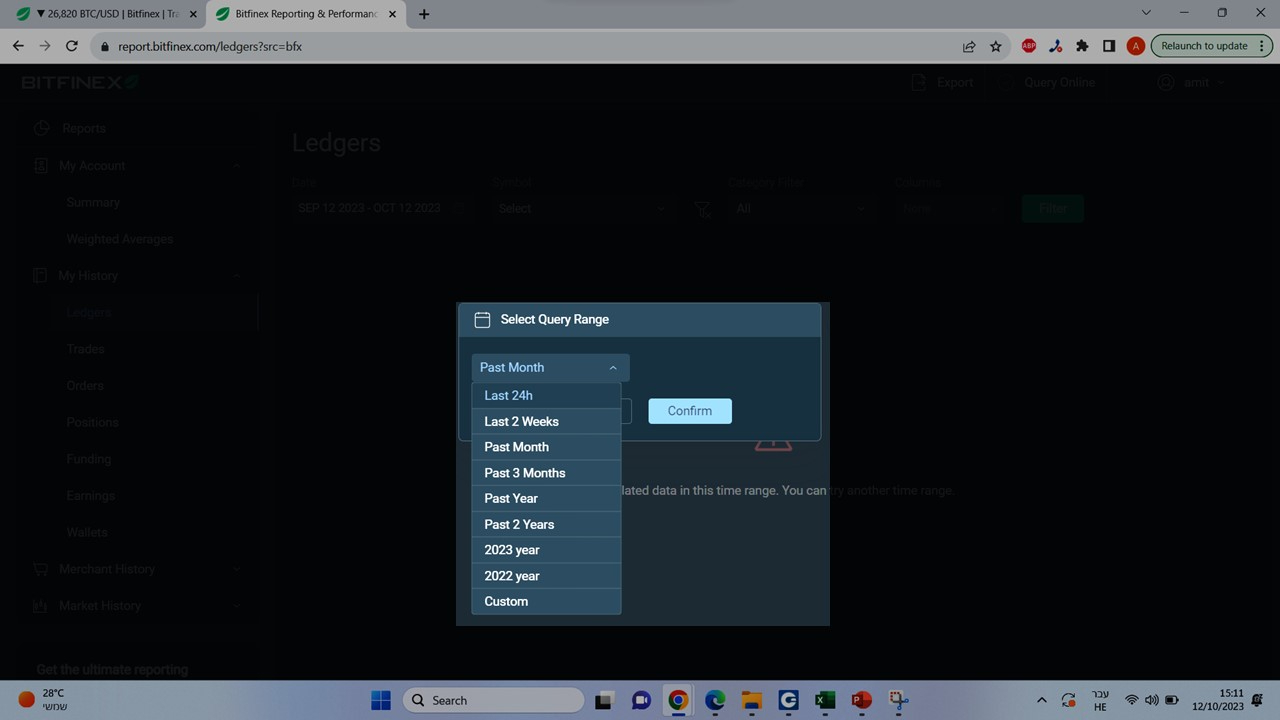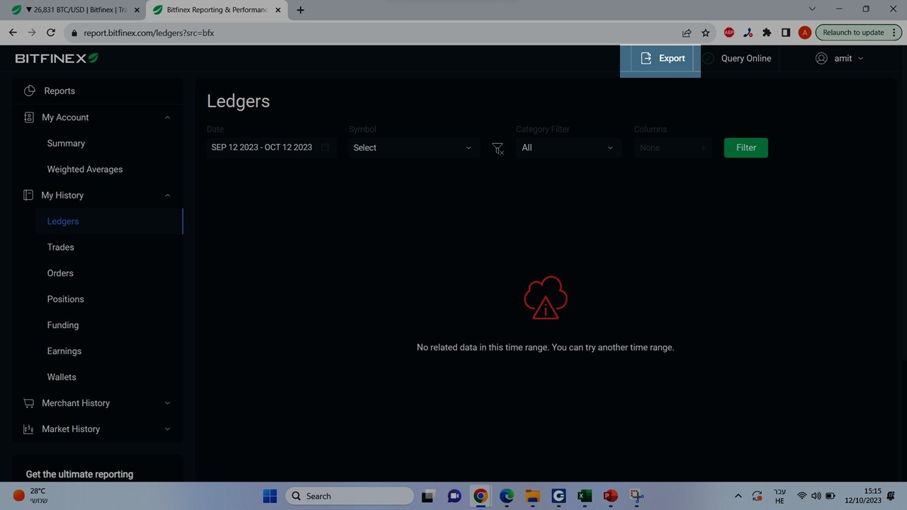 יש להתחבר לחשבון Bitfinex ולאחר מכן לגשות לעמוד Export Ledgers בכתובת https://report.bitfinex.com/ledgers