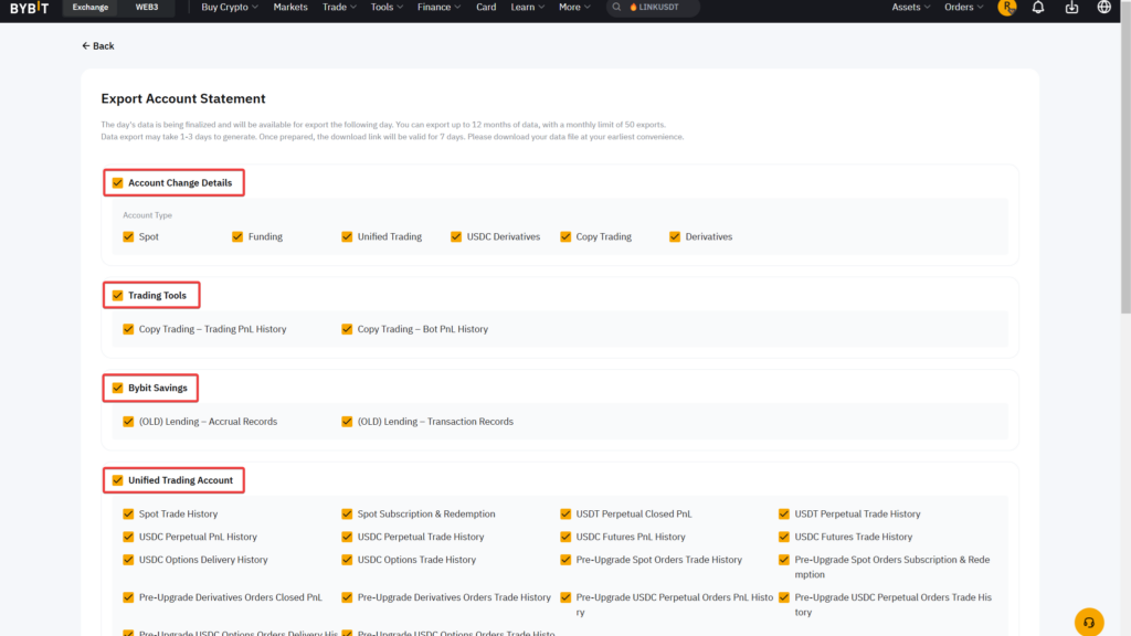 בחר את כל סוגי החשבונות ש-Bybit מאפשרת לייצא: